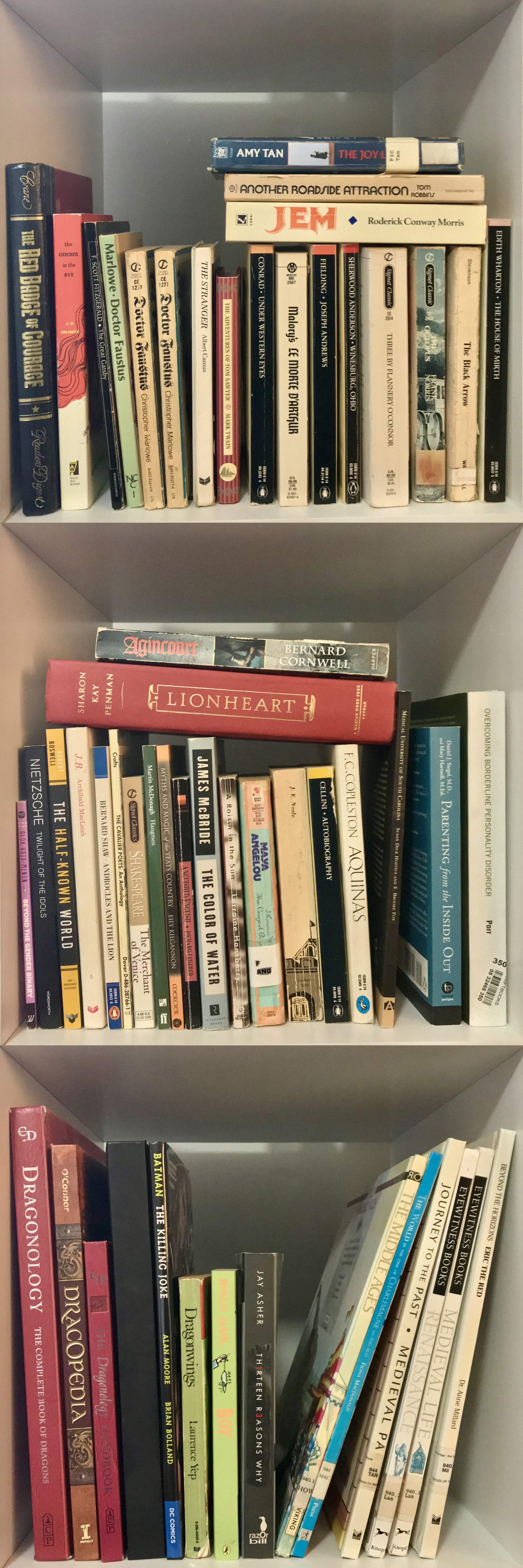 The Joy Luck Club by Amy Tan Another Roadside Attraction by Tom Robins Jem by Roderick Conway Morris Under Western Eyes by Joseph Conrad Le Mort d'Arthur by Thomas Malory Joseph Andrews by Henry Fielding Winesburg, Ohio by Sherwood Anderson Three by Flannery O'Connor The Octopus by Frank Norris The Black Arrow by Roberty Louis Stevenson The House of Mirth by Edith Wharton The Adventures of Tom Sawyer by Mark Twain The Stranger by Albert Camus Doctor Faustus by Christopher Marlowe The Great Gatsby by F. Scott Fitzgerald The Catcher in the Rye by J.D. Salinger The Red Badge of Courage by Stephen Crane Agincourt by Bernard Cornwell Lionheart by Sharon Kay Penman Beyond the Gender Binary by Alok Vaid-Menon Twilight of the Idols by Nietzsche The Half-Known World by Robert Boswell J.B. by Archibald MacLeish Androcles and the Lion by Bernard Shaw The Cavalier Poets: An Anthology The Merchant of Venice by Shakespeare Hangmen by Martin McDonagh Myths and Magic of Yeats Country by Eily Kilgannon Anguished English by Richard Lederer The Color of Water by James McBride A Raisin in the Sun by Lorraine Hanberry I Know Why the Caged Bird Sings by Maya Angelou Queen Elizabeth I by J.E. Neale Cellini, Autobiography Aquinus by F.C. Copleston Medical University of South Carolina by Susan Dick Hoffius and E. Brook Fox Parenting from the Inside Out by Daniel J. Siegel and Mary Hartzell Overcoming Borderline Personality Disorder by Valerie Porr Boy by Roald Dahl Thirteen Reasons Why by Jay Asher Dragonology: the Complete Book of Dragons by Dugald Steer
